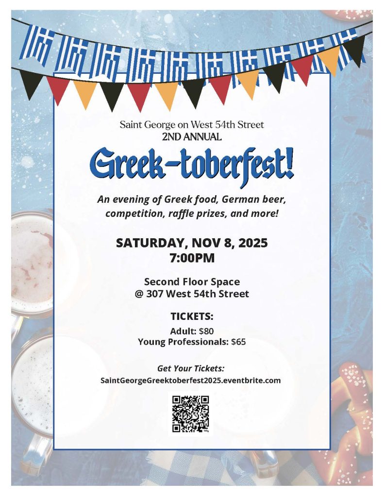 Greek-toberfest is BACK on Saturday, November 8 in the second floor space at Saint George. It will be an evening of Greek food, German beer, live music, fun competition, and raffle prizes. Join us for our annual fundraiser!