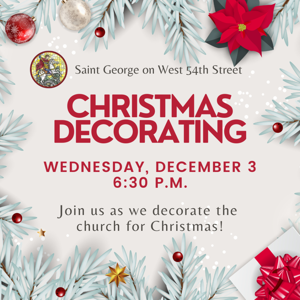 Join us on Wednesday, December 3 at 6:30 p.m. as we decorate the church for Christmas. Many hands make light work!