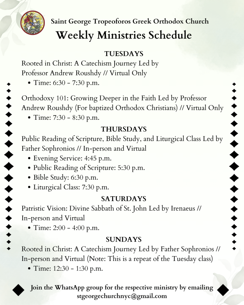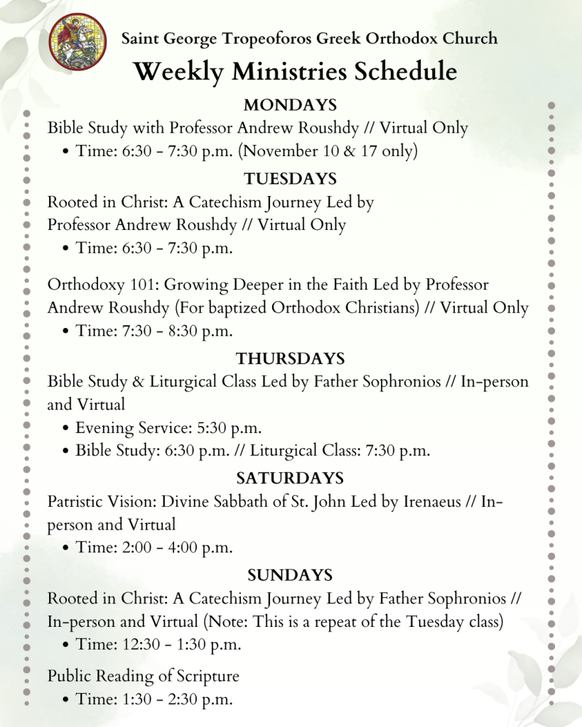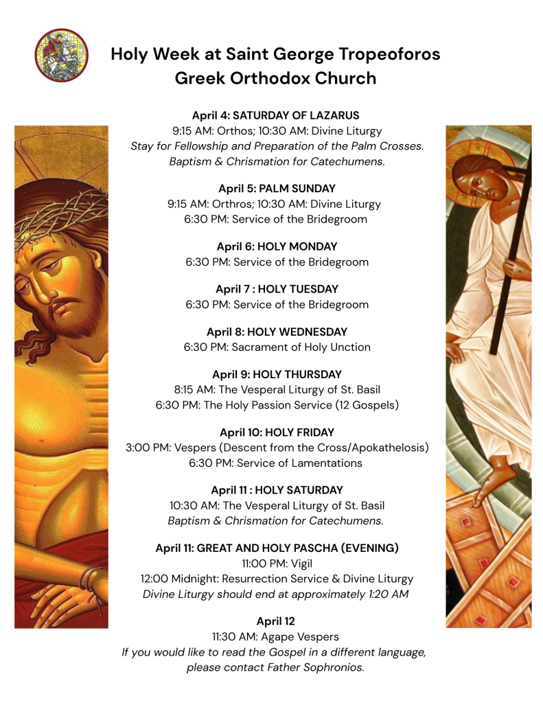 Saint George’s doors are open every Sunday for Orthros and Divine Liturgy. Please see the schedule below for additional services throughout the month.