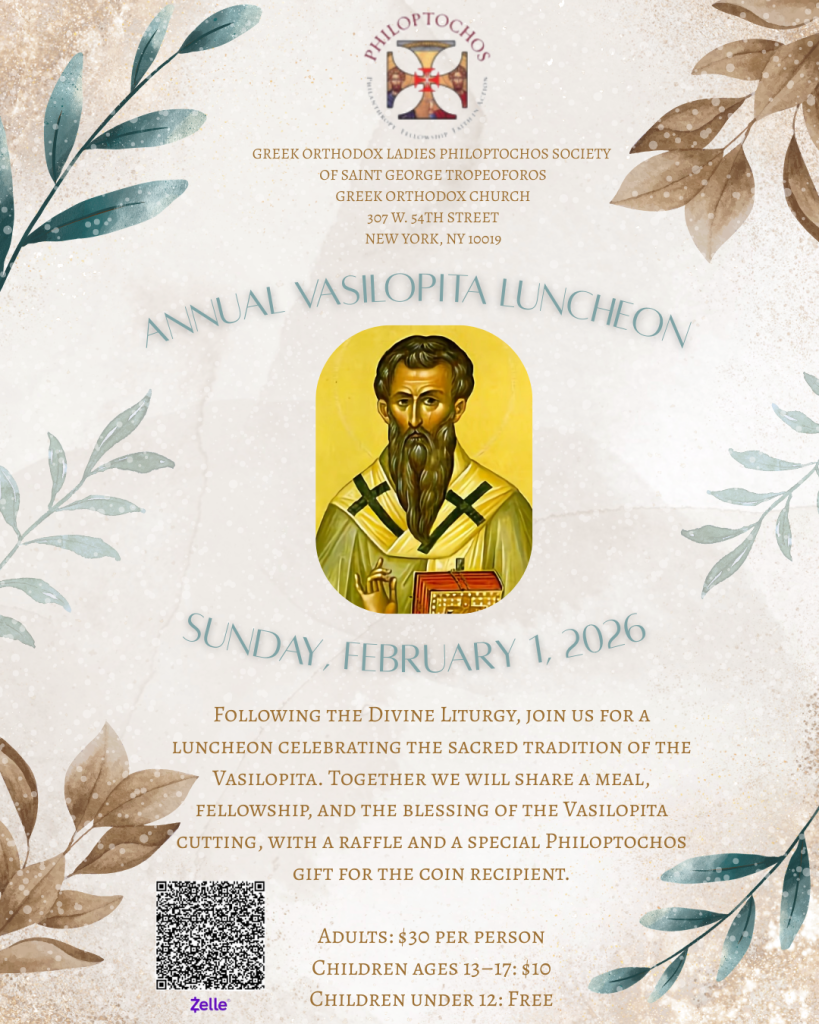 Join the Philoptochos for their Annual Vasilopita Luncheon. Together, we will share a meal, fellowship, and cut the Vasilopita together. There will also be a raffle and a special gift for the coin recipient.