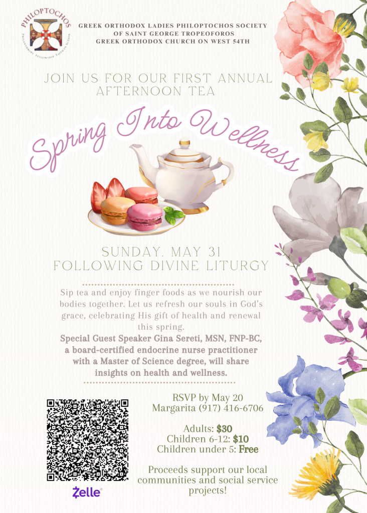 Join the Ladies Philoptochos at our first annual afternoon tea event titled “Spring into Wellness.” We will sip tea and enjoy finger foods as we nourish our bodies together.