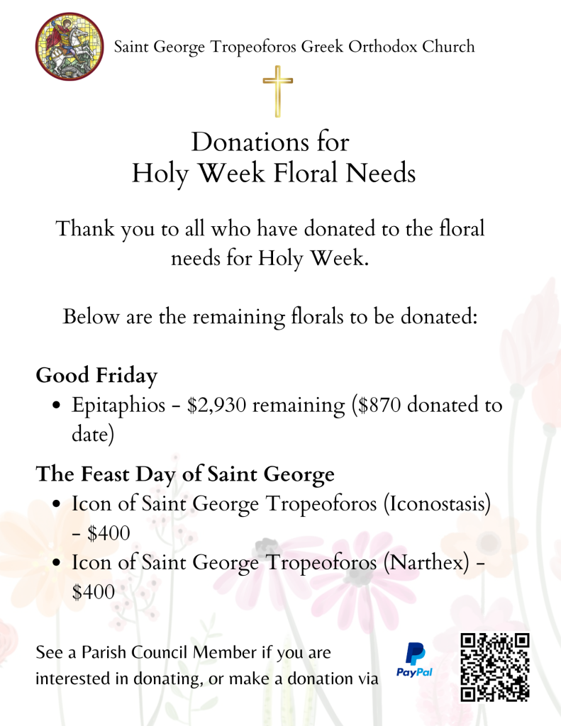 Saint George’s doors are open every Sunday for Orthros and Divine Liturgy. Please see the schedule below for additional services throughout the month.